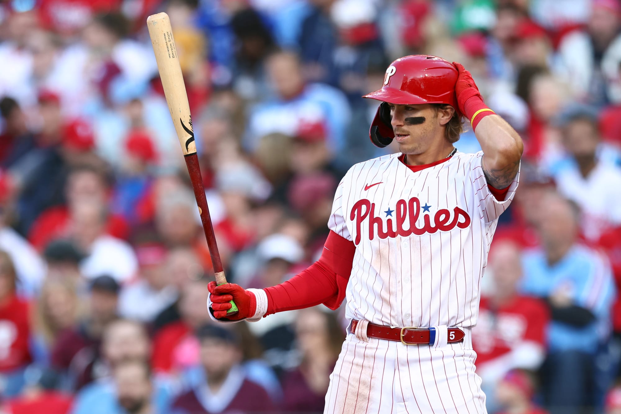 El jugador de cuadro de los Filis de Filadelfia, Bryson Stott, se quita el raro sombrero de platino