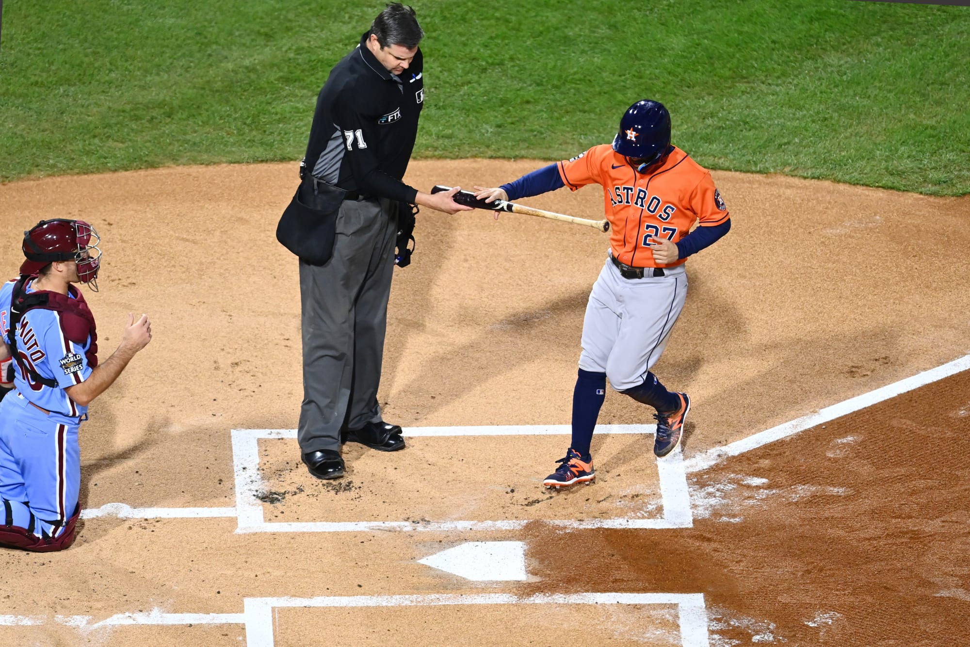 El árbitro de la MLB, Jordan Baker, y el segunda base de los Astros de Houston, José Altuve, fueron la extraña pareja perfecta durante el Juego 5 de la Serie Mundial.