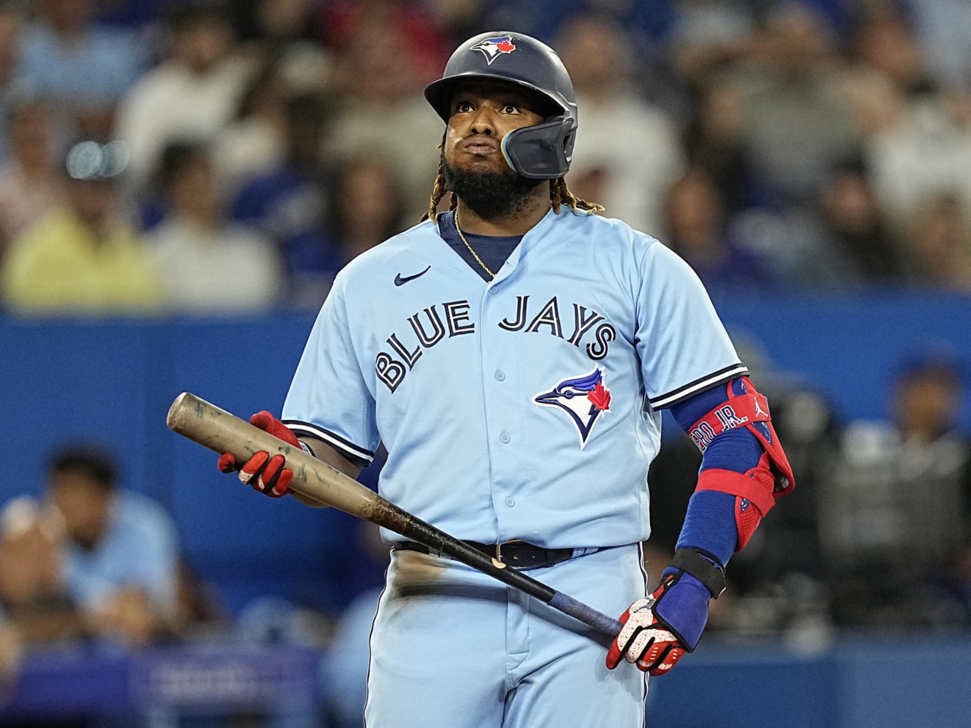 Mira a Vladimir Guerrero Jr. dejar el banquillo para enfrentarse a Nick Pivetta tras HBP